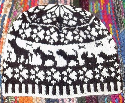 My Christmas pattern 2018: It is a dog breed parade hat for you. It hast different dog breeds all along (Westie, shepherd, dachshound, Schnauzer, Beagle) as silhouettes. And there are plenty of dog paws on the hat.