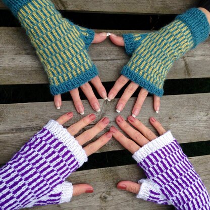 A treat for your own hands or the perfect holiday gift for smartphone users! These fingerless mitts will keep the wearer warm and toasty through the colder months. Knit in the round with two contrasting sportweight yarns, the mitts have a striking graphic pattern that looks great in any colour.