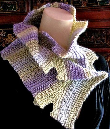 Notch started out as a way for me to test the Thaxton cowl and take the pattern out of beta. I fell in love with the long-striping yarn effects. To get notches on both sides of the scarf, the wedges alternate so that the textures face the front.