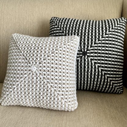 NOVA CROCHET PILLOW PATTERN > Inspired by the traditional granny square and a celestial starburst, this modern take on the square has straight lines and symmetry in an homage to the squares made by the generations before. This pattern includes details for two size options – 14x14” and 18x18” pillows but the pattern can be adjusted for any size square pillow. Like all the Blue Feather Crochet pillow patterns, the NOVA is designed to neither have a front or back, nor an up or down. While the pattern is made in neutral colors, the NOVA can be made in any two colors and will be sure to add an extra element of style to your home décor. Pillow is crocheted together - no sewing required. Skill level: Advanced beginner Yarn: Medium worsted Hooks: 5mm (H-8) Pillow inserts required: 14"x14" and/or 18"x18" Pattern in standard US terms and includes detailed instructions and photos.