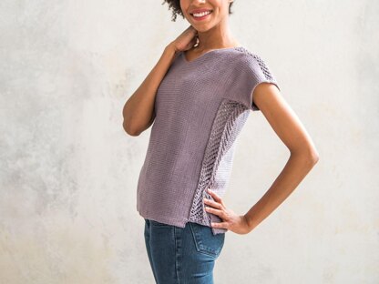 **Novel-T is a sweet summer sweater knit with my unique side-to-side Novus construction!**Novel-T has a simple Chevron stitch going up the sleeve and across the shoulder with the same Chevron stitch at the side panels.