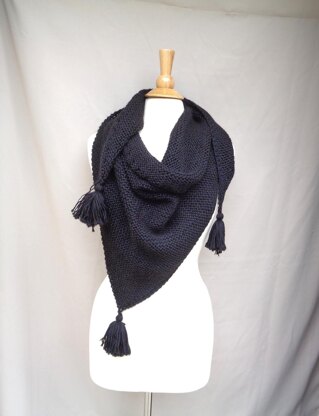 This triangle shawl is super soft and squishy knit in garter stitch. Tassels and eyelets add a fun touch. Wrap around the neck backwards for a cozy, fashionable scarf.