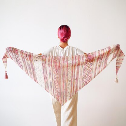 The pattern contains charts, row-by-row instructions and detailed stitch counts. The design is symmetrical. Stripes from the first half of the shawl are mirrored in the second half, but worked in opposite colors. This design was created to highlight the beauty of combining two hand-dyed colorways. For each color, use 350-400yds / 320-365m of fingering weight yarn or mohair + fingering. The pattern would work great even if one of yarns is heavily variegated. Dive into your stash, pick any two colors and watch the pattern do its magic ♡