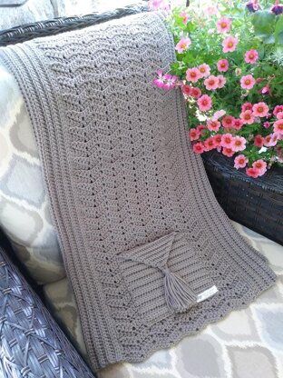 Ocean Waves Shawl Pocket – Wrap yourself in this beautifully textured, warm, and cozy shawl pocket. The addition of the chain spaces and working over chain spaces creates soft rolling waves. Working in the back loop only, gives the fabric beautiful texture of ridges. The subtle chevron stitch used in this shawl creates a delicate, lacey, and elegant finish. This also provides the shawl with a stunning scalloped edge. The added pockets are done using HDC BLO with an envelope style flap, finished off with a tassel. The sizing on this shawl can be modified by adding/decreasing rows and stitches. Any #4 worsted weight yarn, will work for this pattern.