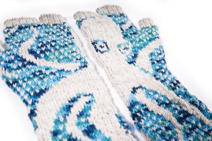 These fingerless mitts are designed to keep your hands cozy in the sub-Arctic temperatures of your office in July. The left and right mitts are identical, and make the complete octopus across both forearms with palms held up. The Octopoda are slightly slouchy and provide full coverage from the elbows to your first knuckle. The thumb split is worked using a modified Phalangees Technique; as is the split between the front and back fingers.