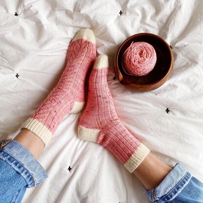 The idea for this sock design began with the yarn. When Madelinetosh put out a collection inspired by the show Stranger Things, my eye was immediately caught by the color Barbara Deserved Better. In my humble estimation, it is the perfect pink - warm, with orange and deep purplish navy speckles.