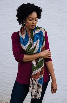 Let the Odyssey Wrap point the way to your next adventure! Bands of vibrant color make up this chevron moss stitch scarf, crocheted in squishy superwash merino wool. The twisted fringe sways as you move, adding a playful bounce to your travels.