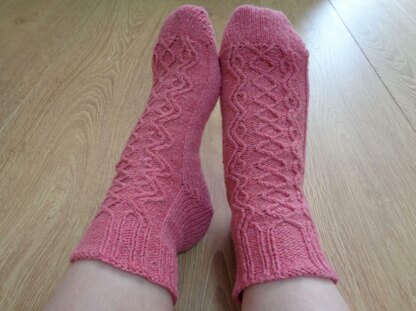 The oft socks have a cable knit panel running down the front of the ankle and foot. The socks are knitted from the toe up and the heel and toe are worked seamlessly using short row shaping.