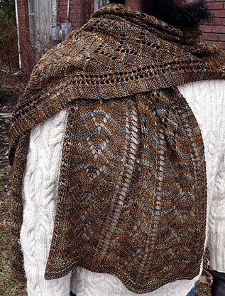 A cuddly wrap or scarf with columns of flying geese and cattail motifs, to keep even the coldest north wind away from neck and shoulders. Knit from hem to center back in two halves and grafted, the wrap is patterned for two lengths and the scarf for one.
