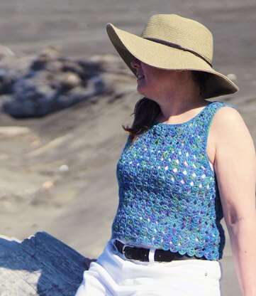 This crocheted top is worked from the top down in pieces. The front and back are sewn at the shoulder and side seams then moss/linen stitch is worked along the armhole and neck openings. Wear it over a tank or long sleeve top depending on the weather.
