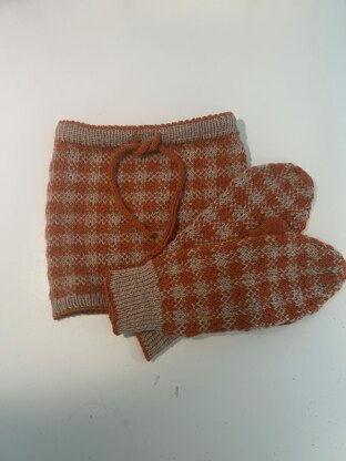You need 1 ball of each color for the mittens and 1 ball of each color for the neck warmer.