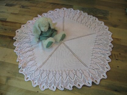 I wanted to make a simple baby blanket, using stockinette for the middle and then a fancy lace edging. I found an old, Danish doily pattern that was very interesting. It had the simplicity I wanted, it had a texture change and I could tell that after blocking it would have a nice scalloped edge. After charting and making changes to the stitch pattern; the blanket came together.