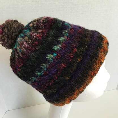 The slip stitch gives the hat a nice chunky cozy feel. It sports a doubled brim and a removeable pompom.