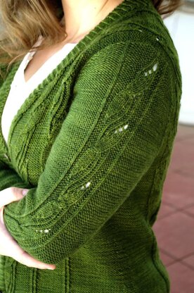 Yet again, my neighborhood inspires me! Olivenhain (means “Olive Grove” in German) is a name of community in the city of Encinitas, CA, originally settled by German colonists in the late 19th century. Knitted from the top down, this v-neck cardigan features the pattern which reminded me of olive branches, waist shaping and imitation of the set-in sleeves.