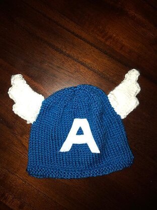 This newborn size hat is knit in the round with double pointed needles, and the wings knit flat. The hat is colour Cobalt and a small amount of white for the wings. White felt was used to the letter A and glued to front of hat.
