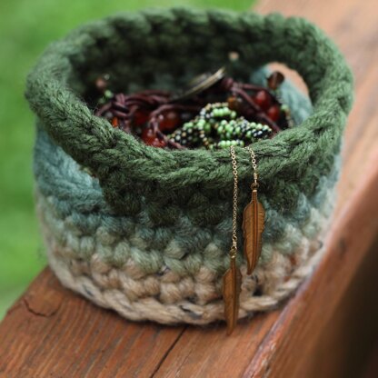 This is the "Ombre Mini Handled Basket" crochet pattern. This adorable (and tiny!) basket is the perfect stash busting project! Make one to display your favorite tiny treasures, put a mason jar in for an adorable bud vase, or make a whole set for your highball glasses.