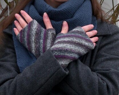 These mitts are worked in garter stitch on the bias, which is emphasized by a yarn that slowly changes colors. The thumb gusset is cleverly integrated into the design. There is just one challenge: grafting in garter pattern. Fear not, the instructions tell you how to do it! Besides this, you need to know how to knit, increase and decrease. Also a great pattern for sock yarn scraps!