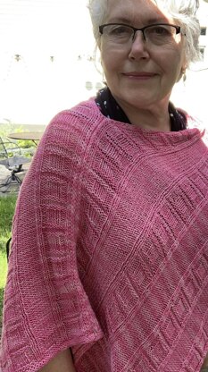 This little poncho provides just enough coverage to warm the shoulders and give a bit of "dress up" to a casual summer outfit. It is easily adjustable In size by adding more repeats or stitches. I used almost all of my 730 yds (667.5 m) of this lovely summer yarn with just enough for a decent sized gauge swatch. More yarn will be required to make it larger. There are other options for a sport weight yarn. Anzula Vera yarn is light as a feather due to the silk/linen mix which makes it great for summer. I wore it to appointments on a hot and humid day and felt very comfortable because of the fiber content. This knit provides some interest with the addition of intentional selvedge stitches that border both sides of the pattern. A fun applied I-cord trims the two short edges