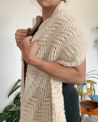 One step at a time is a thick, chunky, textured wrap / oversized scarf with diagonal pillars of cables running through different density of fabric to create a cosy accessory for cooler weather.