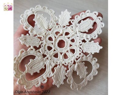 Modern crochet Irish lace pattern . A detailed pattern for all crochet motifs - a graphic diagram, a photo and a verbal description of each crochet row. Design work by Starostina Olga.