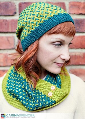 A textured hat with a playful, slipped stitch, colorwork pattern. Directions are provided to work the stitch pattern with stripes or without, creating two very different effects. The yellow & grey sample uses only slipped stitches for colorwork meaning you are only ever working with one color at a time. The teal & green sample has just one stranded round every 4th round making it an easy introduction to stranded knitting for a beginner. Pick up the matching cowl pattern to make a set with reversed colors as shown in the photos!