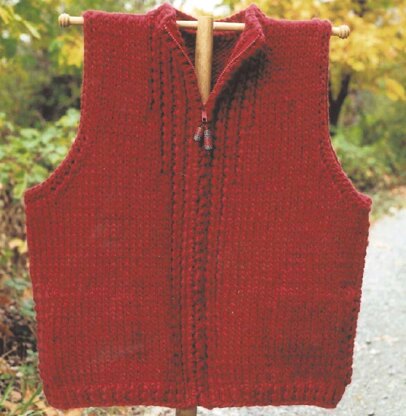 This easy to knit outerwear vest with pockets is a favorite for the whole family. Zippered front clusure. Knit in heavy worsted, chunky, or superbulky weight yarn. Adult sizes 38 to 53 inches at bust/chest. 24" long.