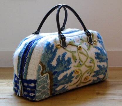 Take the sort of patterning you find on carpets of the Far East and mix it with the shape of a Doctor’s bag and you get this design. ‘Orient’ is very generously sized with highly decorative sides worked in intarsia and a stranded colourwork base. It’s knitted in an Aran weight yarn and embroidered then felted / fulled to both blur the colours and add to the structure of the bag. Additionally, a plastic grid type base inserted into the bottom of the bag stops it from sagging when used whilst Italian leather handles and ‘antiqued’ metal bag feet add the final finishing touch.