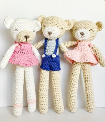 La medida final del muñeco dependera del grosor del hilo y el ganchillo seleccionado . En este modelo los ositos tienen unos 28 cm de largo aproximadamente La tecnica amigurumi , utiliza basicamente el punto bajo o crochet simple, Es una tecnica sencilla y en este modelo las costuras son minimas ya que casi se teje cabeza, cuerpo y piernas todo junto , solo se deben coser los brazos , las orejas y el hocico . Lo que lleva mas dificultad, tal vez, es el vestido, en caso de realizar la osita ya que son puntos vareta