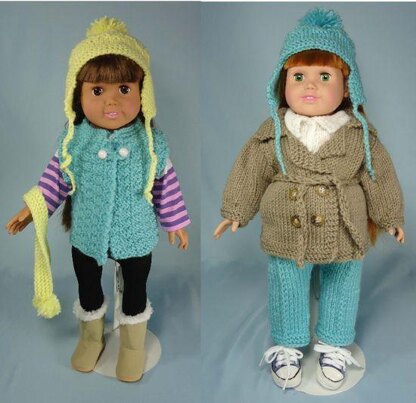 Best and cutest things to wear outdoors, for 18 inch dolls! 5 Piece wardrobe! Cozy double breasted jacket, trousers, warm outdoor vest, earflap hat, and cozy scarf. All that is needed to keep your 18 inch doll warm! Uses worsted weight yarns, knitting needles, US sizes # 5 and 7. Fun and fairly easy!