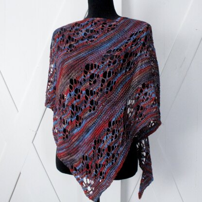 Oxford is a dignified triangular-shaped one-to-three skein shawl that is worked on the bias. The lace sections and garter switch up often enough, creating a knit that never becomes tedious to work on.