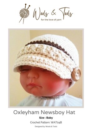 This adorable newsboy hat is the perfect addition to a little baby's accessory collection. It not only looks adorable, but on a sunny day it keeps the sun away from baby's face, and in cooler weather, it keeps baby's head warm. This is my original design, and it features 2 large buttons on either side of the visor and a ribbed strap. Now you can make your own baby newsboy hats like this one, designed for you at the Wools & Tools studio.