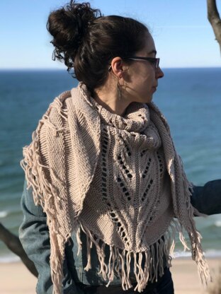 The Oyster Bay shawl is worked semi-loosely on chunky yarn from the top down. It has a traditional triangle shape with increases happening on right side/patterened rows. As you work through the repeats you will easily memorize the pattern and likely find that you can work this project without referencing the chart/instructions for the majority of the shawl body.