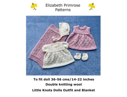 The Dress has a little knots pattern and moss stitch edgings. The front, back and sleeves are knitted separately on straight needles and sewn together. Stitches are picked up to complete the neckline and for the buttonband. For the Sleeveless Dress, stitched are picked up for the armhole edges. The Bonnet has i-cord ties and pompoms. Also included is a pattern for Bootees and a Blanket.