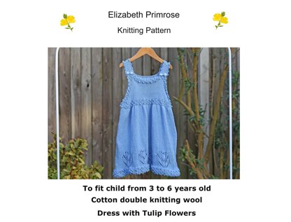 The dress has tulip flowers to the front and back. The hemline has a reverse stocking stitch and bobble pattern which is also repeated around the neckline. The front and back are knitted separately on straight needles and the sides sewn together. Buttons are added to the front to fasten the dress to the straps.