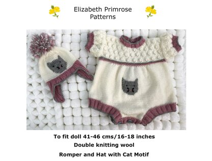 Romper Suit and Hat with Cat Motif to fit 41-46 cms/16-18 inch Doll