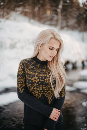 The sweater is knitted from alpaca yarn and accented with combinations of amber Latvian characters. They show the sign of Dievs (God) - the basis of all Latvian writings, the sign of the feminine Saule (Sun), the cross of Māra and elements of Austra (dawn) tree. These strong Latvian signs were used by our ancestors for beauty, strength and protection and are still very much in use today.