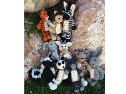This set of PDF patterns is for intermediate knitters knitting flat on two needles. It includes instructions for making 10 different animals: Bunny, donkey, elephant, giraffe, leopard, lion, panda, skunk, tiger, zebra.
