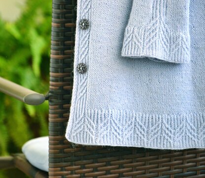 Pale Breeze cardigan is knit in stockinette, accented with a delicate twisted stitch cable through the collar, button band, cuff and hem. The sweater is worked in one piece, seamlessly from the top down using the contiguous sleeve construction.