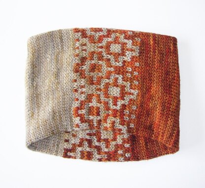 It is knitted in the round and Instructions are given for making it in sock, DK or Aran weight. The width and circumference of the cowl are very easily adjusted so you can use different weight yarns or make the cowl a different size.