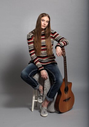 A comfortable casual featherlight loose knit mohair, wool & silk sweater with shaped sleeve tops and 3 x 1 Rib neckband, cuffs and bodice band. Knitted with Jo Sharp Mulberry Silk Georgette & Rare Comfort Kid Mohair yarn.