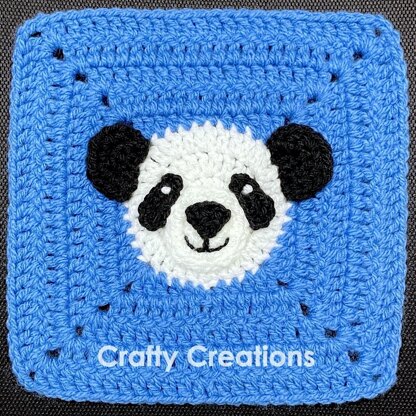 This panda granny square is approximately 20 cm x 20 cm (8.15” x 8.15”), and can be used as a component for crocheted items such as a blanket or cushion cover. The square can be used repeatedly, or with others.