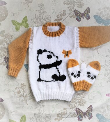 An unusual and unique Sweater and Mittens featuring Pandas and Butterflies for ages 4 to 13 years.