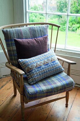 This rectangular Fairisle cushion (from Martin’s More Easy Fairisle Knits) is knitted in three colours of Rowan Felted Tweed, and features a central horizontal pattern of sailing boats in blue and brown between rows of waves in alternating blues and browns on a neutral ground. It has only two colours in a row.