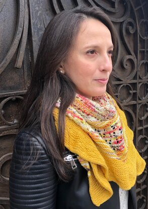 Worked top-down, the Paquetá shawl has a half-circle shape, divided in 3 sections consisting of: a squishy garter stitch body with eyelets, stripes combined with an airy lace stitch pattern, and the last section is a slightly ruffled, wavy edge.