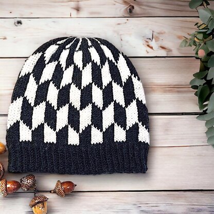 This hat is made up of parallelograms placed side by side to form a chevron pattern. The chevrons seem to disappear into the crown as you decrease, making a spiral that looks like a pinwheel on top. It reminds me of a circus tent somehow and feels festive, but is also classic and reserved. You can do it in any combination of colors to get different effects, from bright and bold, to subdued and neutral. It’s very easy to knit because the colored sections are small and you don’t really need to catch floats if you don’t care to. I don’t.