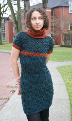 A very fitted dress worked in textured stitches from the bottom up. Cowl is worked separately and grafted to the neckline using kitchener st.