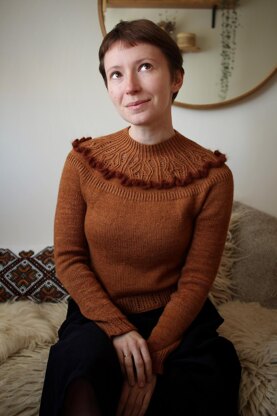 Knit seamlessly from the top down in the round, it features a closely fitted round yoke that showcases a beautifully detailed, petal-like pattern. The boxy body offers a relaxed yet refined silhouette, complemented by tapered sleeves for a balanced fit. Subtle lace elements adorn the side panels, hem and cuffs, adding a touch of delicate sophistication.