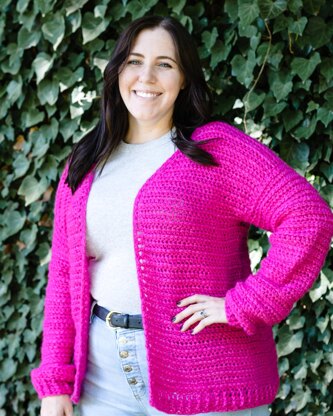 You will need 5 (6, 6, 7, 8) (9, 10, 11, 11) skeins of WeCrochet Wonderfluff (142 yards / 50 grams; 70% Baby Alpaca, 7% Merino Wool, 23% Nylon) in Cosmopolitan for sizes XS (S, M, L, XL) (2X, 3X, 4X, 5X) or 660 (745, 835, 930, 1060) (1195, 1325, 1480, 1560) yards of similar bulky weight yarn that matches gauge.