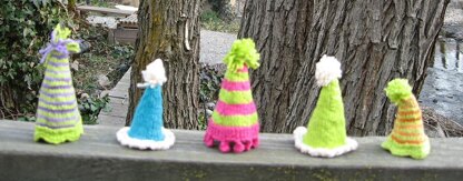 I just used whatever fixation I had leftover in my stash. Each party hat has a different edging and different body. I enjoyed picking the bright colors and decorating with a pom pom. You could even add a little elastic hanging down just like a real party hat.