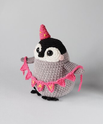 Who wouldn't love a fluffy little penguin in a party hat! Made in a combination of chenille yarn for a fluffy body and smooth DK cotton for the details this little penguin is really quick to make and needs just a ball of each mini yarn.